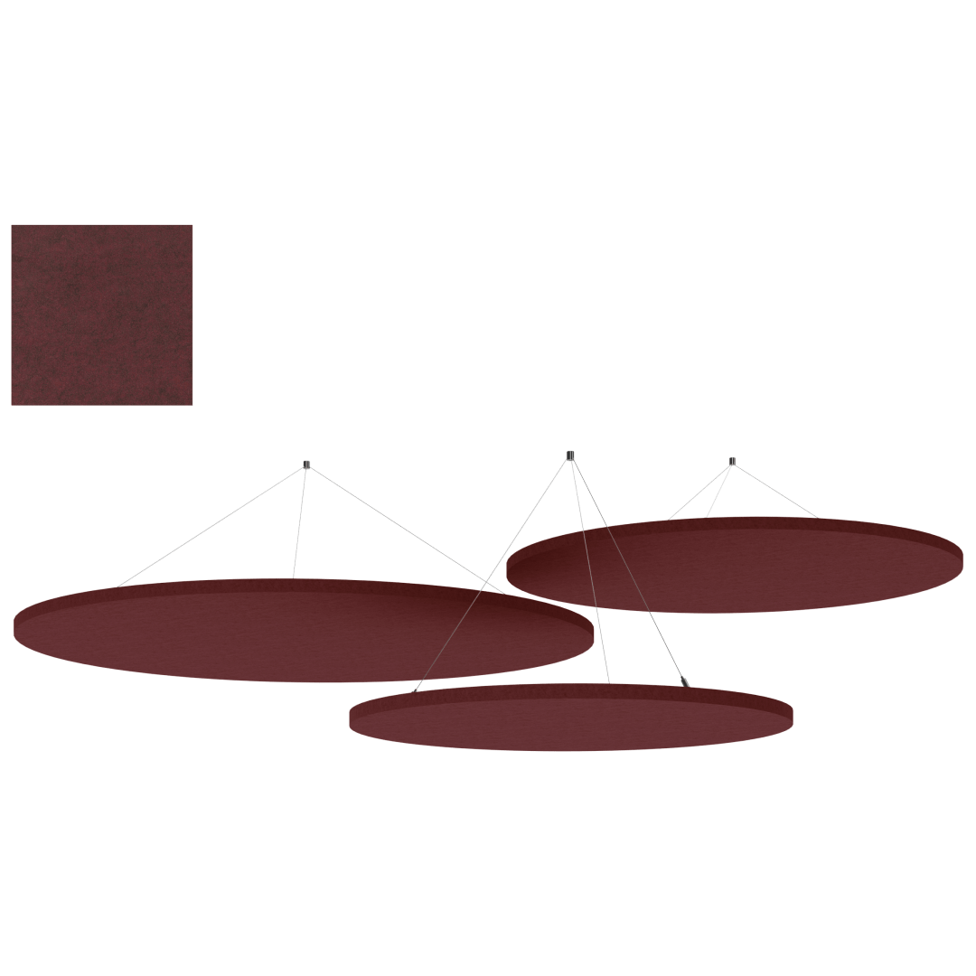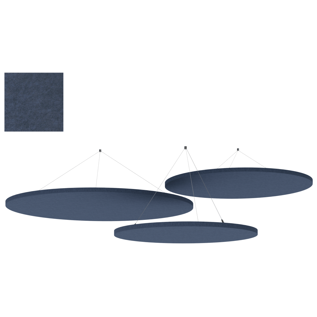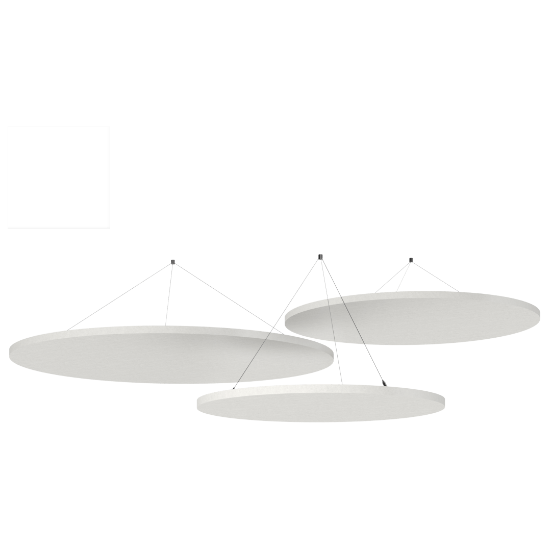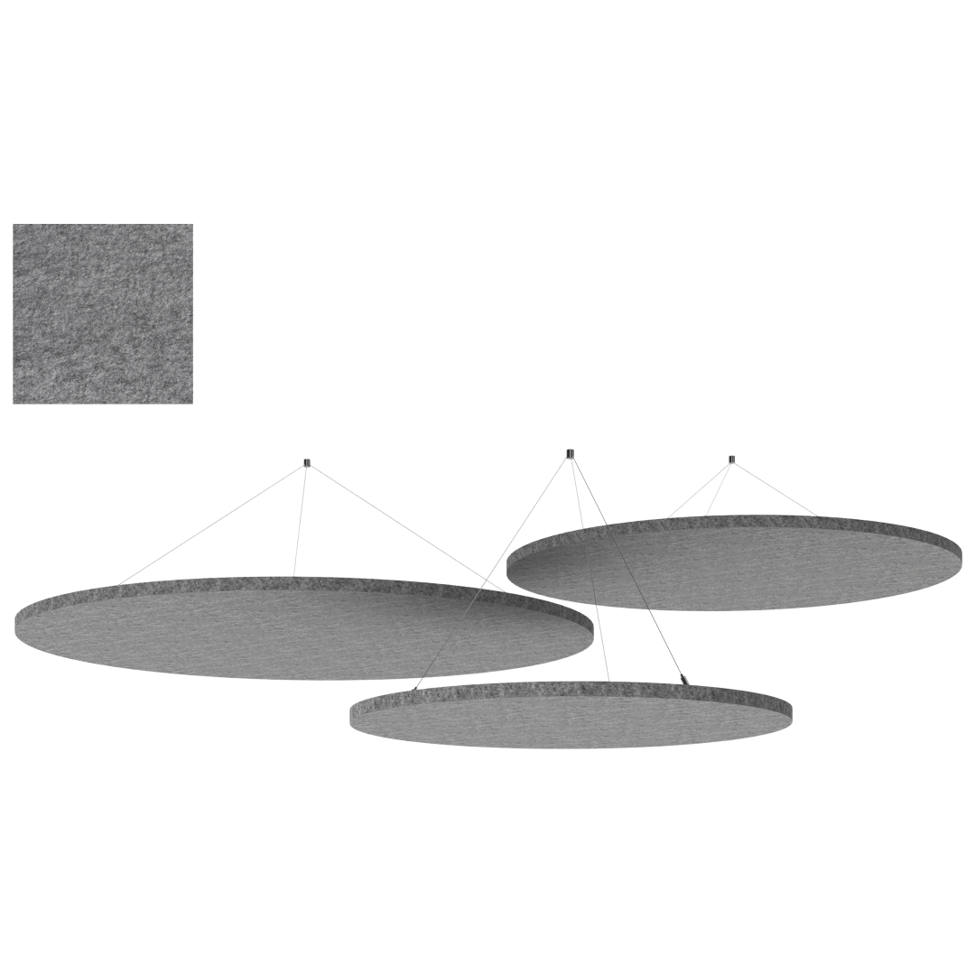 Hochwertige runde Akustik-Deckensegel im 3er-Set für effektive Schallabsorption und modernes Design. Aus schwer entflammbarem Schallschutzvlies (B1), in Filzoptik, inklusive 3-Punkt-Drahtseilabhängung. Ideal für Büros, Besprechungsräume, Praxen und Wohnbereiche.